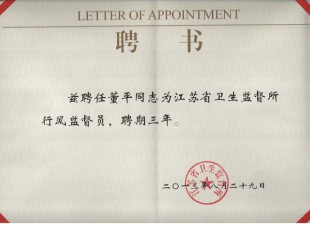 8月29日,水杯子董事長董平教授被江蘇省衛(wèi)生監(jiān)督所聘請為行風(fēng)監(jiān)督員,聘期三年,行風(fēng)監(jiān)督員的主要任務(wù)是實事求是、客觀公正地開展衛(wèi)生督查工作,為衛(wèi)生監(jiān)督行風(fēng)建設(shè)建言獻策,提出寶貴意見和建議。此次江蘇省內(nèi)僅有12位企事業(yè)領(lǐng)導(dǎo)獲此殊榮。