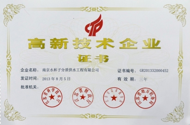 2014年1月10日,南京水杯子分質(zhì)供水工程有限公司獲批成為高新技術(shù)企業(yè),并取得證書。此次證書的取得不僅是對我公司整體技術(shù)水平的肯定和認(rèn)可,同時也是對我們的一種激勵。