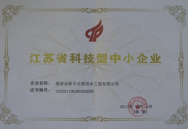 2014年1月23日,南京水杯子分質(zhì)供水工程有限公司獲得“江蘇省科技型中小企業(yè)”稱號,并取得證書。