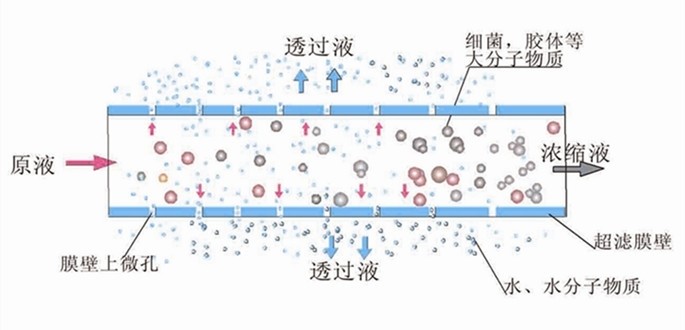 超濾是一種加壓膜分離技術(shù),即在一定的壓力下,使小分子溶質(zhì)和溶劑穿過(guò)一定孔徑的特制的薄膜,而使大分子溶質(zhì)不能透過(guò),留在膜的一邊,從而使大分子物質(zhì)得到了部分的純化。