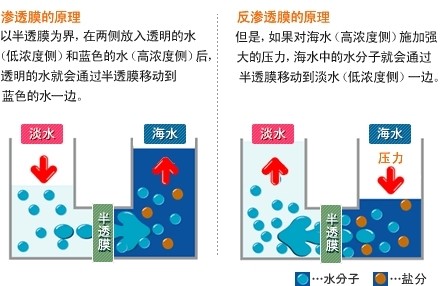 反滲透又稱逆滲透,一種以壓力差為推動力,從溶液中分離出溶劑的膜分離操作。對膜一側的料液施加壓力,當壓力超過它的滲透壓時,溶劑會逆著自然滲透的方向作反向滲透。從而在膜的低壓側得到透過的溶劑,即滲透液;高壓側得到濃縮的溶液,即濃縮液。若用反滲透處理海水,在膜的低壓側得到淡水,在高壓側得到鹵水。
